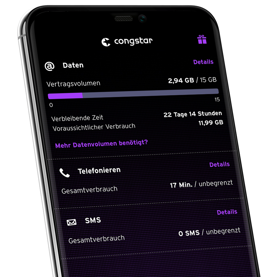 Mit der praktischen Verbrauchsübersicht siehst du, wie viel Datenvolumen, SMS und Minuten du im aktuellen Abrechnungszeitraum bereits genutzt hast und wie viel Guthaben dir aktuell noch zur Verfügung steht.